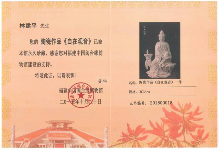 《自在觀音》獲福建中國閩臺緣博物館收藏證書