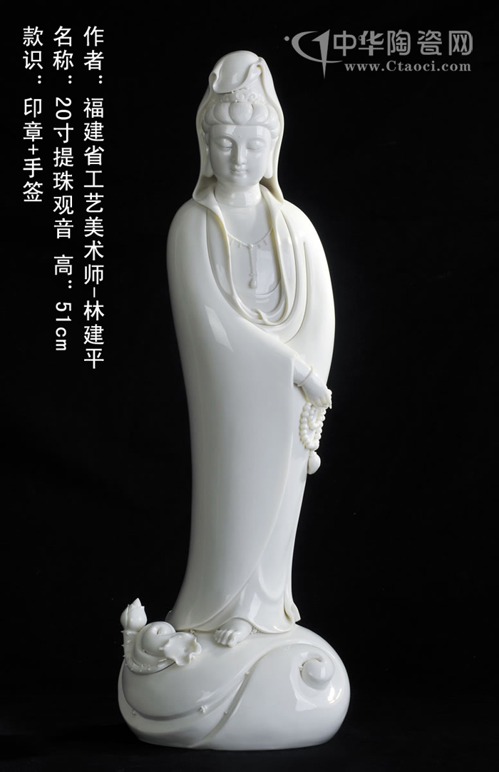 近日,福建中國閩臺緣博物館收藏了兩件德化陶瓷觀音作品——《提珠觀音》、《自在觀音》,其作者是德化新銳陶藝家,福建省工藝美術(shù)師林建平。