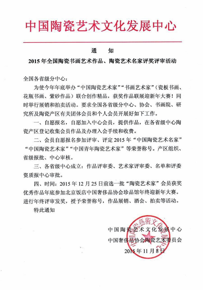 二、會員自愿報名參加評審、評定2015年“中國陶瓷藝術(shù)名家”“中國陶瓷藝術(shù)家”“中國青年陶瓷藝術(shù)家”等榮譽稱號。產(chǎn)區(qū)組織、省級報批、中心審核。