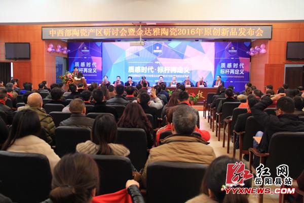 (分站記者 諶良柱 通訊員 張陽)12月11日,中國中西部陶瓷產區(qū)研討會暨金達雅2016年新品發(fā)布會在岳陽縣建材工業(yè)園天欣科技舉行。岳陽市委常委、組織部長、統(tǒng)戰(zhàn)部長王瑰曙,原省商務廳廳長毛敘保,市政協(xié)副主席劉曉英,岳陽縣委書記毛知兵等領導出席。