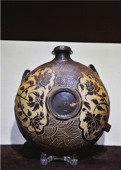 為讓記者全面地觀賞此物,趙志平特將此物固定在展示臺內(nèi)。該扁壺通體給人以開闊、明朗之感:高35cm,口徑6cm,腹徑33cm,小口,卷沿,短徑,腹部扁平,近口部有左右對稱的耳系;正反兩面中間均有一圈足,腹部圈足起放置平穩(wěn)的作用,正面圈足則起對稱加固胎體的作用;主體飾以圈足左右對稱的兩組牡丹花紋,周圍空間用弧弦刻紋填補(bǔ);施褐釉,腹部不掛釉,灰胎,其剔刻線條流暢,造型質(zhì)樸,構(gòu)圖新穎。