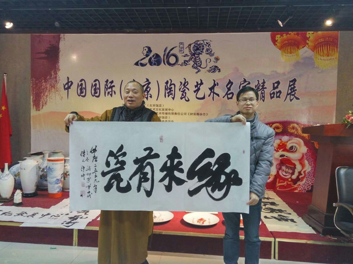 1月20日下午13時(shí)30分現(xiàn)場(chǎng)還進(jìn)行了藝術(shù)家筆會(huì)活動(dòng),溈仰宗第十代傳人凈修法師和中華陶瓷網(wǎng)/博緣陶瓷總經(jīng)理柯維太先生進(jìn)行了親切友好的互動(dòng),凈修法師還為博緣陶瓷現(xiàn)場(chǎng)題字:緣來(lái)有瓷。