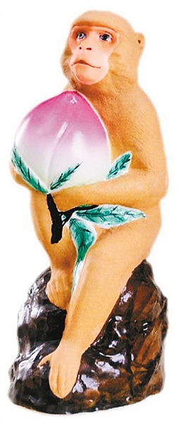 其一,猴子獻(xiàn)桃象征長(zhǎng)壽。這件“金猴獻(xiàn)壽”是景德鎮(zhèn)工藝大師張育賢的作品。作品中一只靈猴身坐仙山福地上,手捧著鮮艷無(wú)比、碩大水靈、香氣馥郁的仙桃。桃為五木之精,傳說(shuō)仙境中生長(zhǎng)的桃樹(shù),三千年一結(jié)果,結(jié)出仙桃是增壽的瑞果。此件器物釉色恰到好處地表現(xiàn)出猴子身上的茸毛以及炯炯有神的目光。作品栩栩如生、動(dòng)感十足,以寫(xiě)實(shí)造型手法賦予了靈猴深邃的文化底蘊(yùn)和現(xiàn)代瓷雕藝術(shù)的審美價(jià)值,以全新的陶瓷藝術(shù)語(yǔ)言表達(dá)了“新春納福、金猴獻(xiàn)壽”的吉祥祝福。
