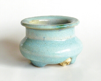 這只元代的鈞瓷小香爐,玲瓏精致,牙白色胎上滿施天藍色釉,自然流淌的釉水微垂于底部,口沿自然窯變的綠斑,使之略顯俏皮,讓人愛不釋手。鈞瓷興盛于宋金,中心窯廠位于河南禹州市。到了元代,各地窯廠競相燒制。與宋代鈞瓷整體釉面厚薄均勻的特征不同是,元鈞釉面大多有垂釉現(xiàn)象,正是這種垂釉使元鈞看起來顯得粗狂、奔放,這只鶴壁窯的鈞瓷香爐造型簡潔,釉面瑩潤、肥厚?趶7.5cm,高5.5cm,其制作精美,釉色清新,似在等待有美人添香。