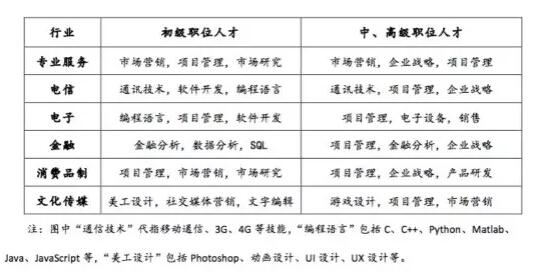 就各個(gè)人才群體的升職所需技能而言,初級(jí)職位人才大多依靠“老本行”獲得晉升,例如專(zhuān)業(yè)服務(wù)行業(yè)的營(yíng)銷(xiāo)能力、電子行業(yè)的編程能力、金融行業(yè)的金融分析能力、文化傳媒行業(yè)的文字編輯能力等。
