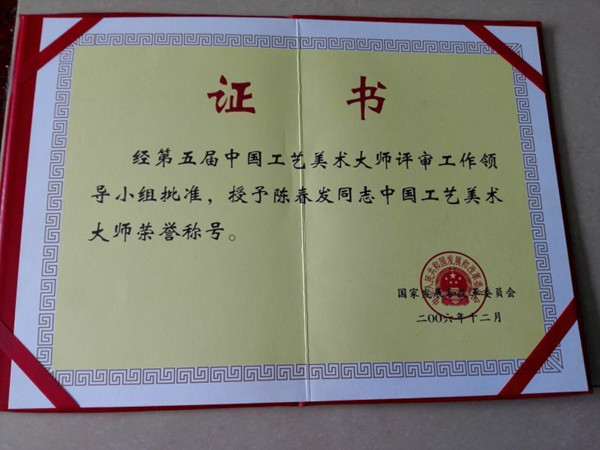 2006年12月,陳春發(fā)被國(guó)家發(fā)改委授予“中國(guó)工藝美術(shù)大師”的榮譽(yù)稱(chēng)號(hào),他的代表作《雪中獨(dú)傲》與《紅梅報(bào)春》榮獲福建省陶瓷藝術(shù)與設(shè)計(jì)創(chuàng)新銅獎(jiǎng)!痘ㄩ_(kāi)富貴》與《國(guó)色天香》榮獲“2009年中國(guó)國(guó)際工藝品及藝術(shù)品收藏品博覽會(huì)”金獎(jiǎng)!秳⒑!贰ⅰ抖珊S^音》與《富貴有余》榮獲“第八屆中國(guó)工藝美術(shù)博覽會(huì)暨古典家具、收藏品博覽會(huì)”中的“中藝杯”優(yōu)秀作品金獎(jiǎng)、銀獎(jiǎng)和銅獎(jiǎng)。