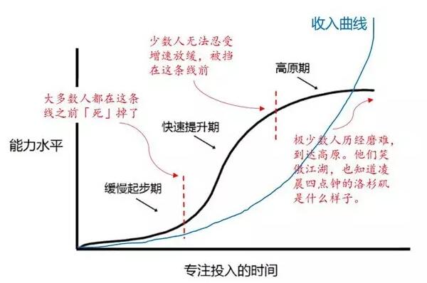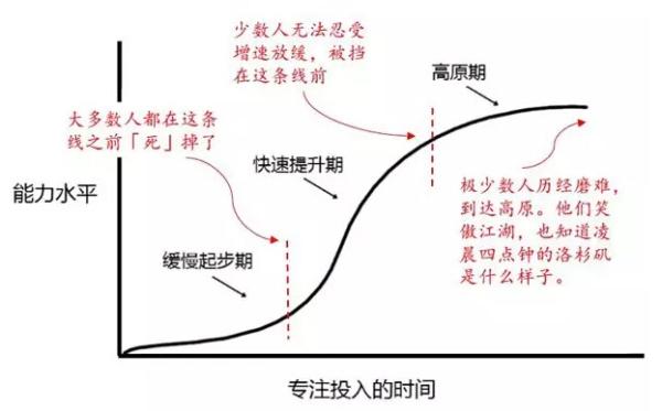 所以,最后的結(jié)果是,在成才的道路上,大多數(shù)人都在緩慢起步期「死」掉了。小部分人爬到了快速提升期。而只有極少數(shù)人到了高原期,笑傲江湖。