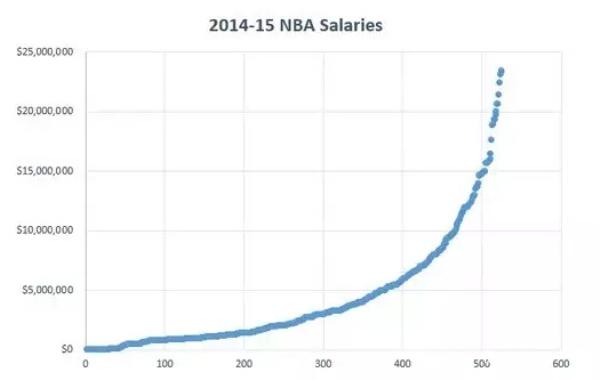 這個(gè)世界的財(cái)富分配是極端極端極端不均衡的。站在塔頂?shù)娜苏加兄@個(gè)世界的大多數(shù)財(cái)富。在靠本事吃飯的領(lǐng)域, 這種不均衡也非常明顯。下圖是2014-15賽季NBA球員的薪酬分布(橫軸表示球員的薪酬排名,越往右則排名越高,縱軸就是年薪的金額):