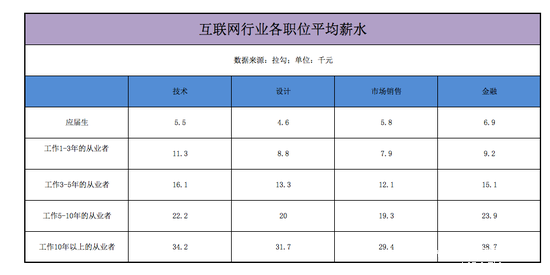 小編整理了一份數(shù)據(jù),從多個(gè)緯度整理了互聯(lián)網(wǎng)行業(yè)的薪資水平。依據(jù)不同的工作年限,在技術(shù)、設(shè)計(jì)、市場(chǎng)銷售、金融這四個(gè)領(lǐng)域,2015年這些職位平均的月薪分別為: