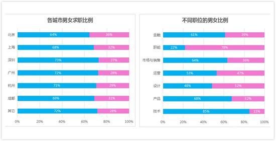 女性求職者的比例,依然要遠(yuǎn)低于男性。從地域緯度看,北京地區(qū)女性求職者占比最高,男女求職比例達(dá)到 64:36。上海男女求職比例為 68:32,深圳為 73:27,廣州男女求職比例為 72 : 28。