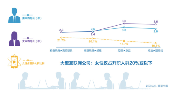 此外,女性在升職過(guò)程中,遇到的障礙也會(huì)高于男性。Linkedin 領(lǐng)英告訴 36 氪,在大型互聯(lián)網(wǎng)公司中,男性占中低層升職人群的 80%,中層向上占比逐級(jí)上升。在工程師崗位上,女性升職難現(xiàn)象較為明顯。男工程師自經(jīng)理升任總監(jiān)平均需花 2.4年,而女工程師則需花 5.5年 能升任總監(jiān),男工程師升職時(shí)間僅為女工程師的一半。