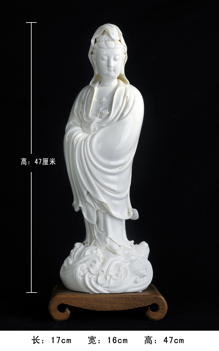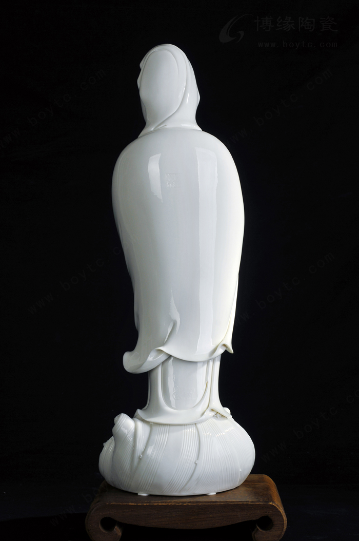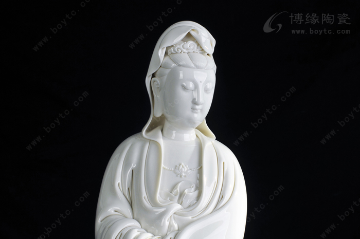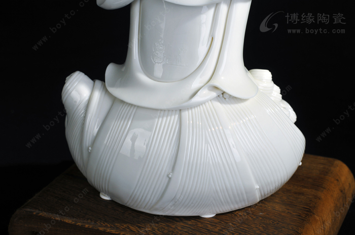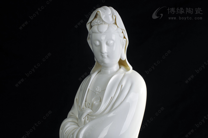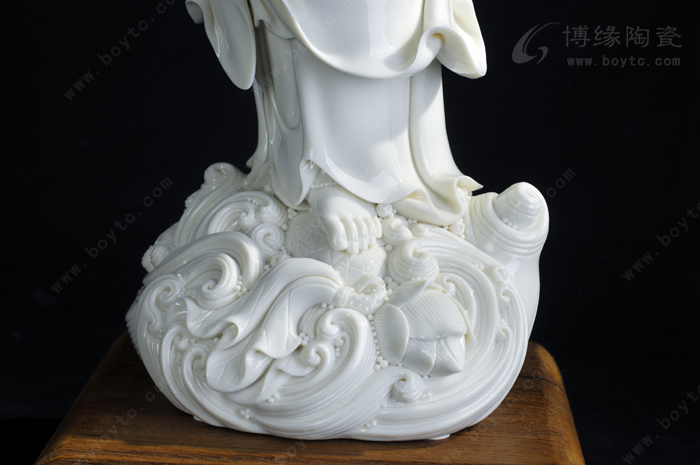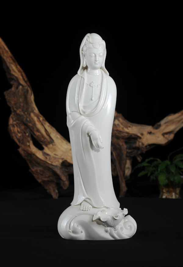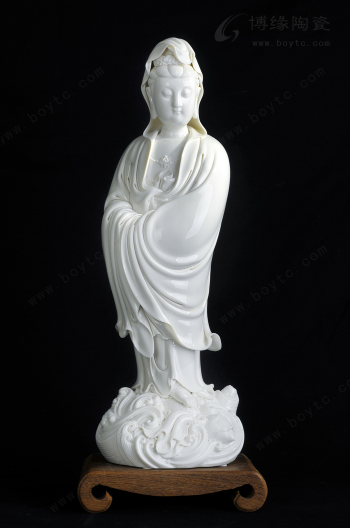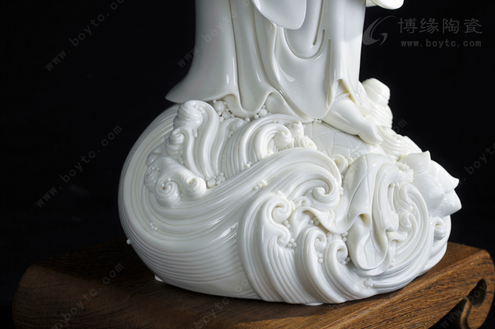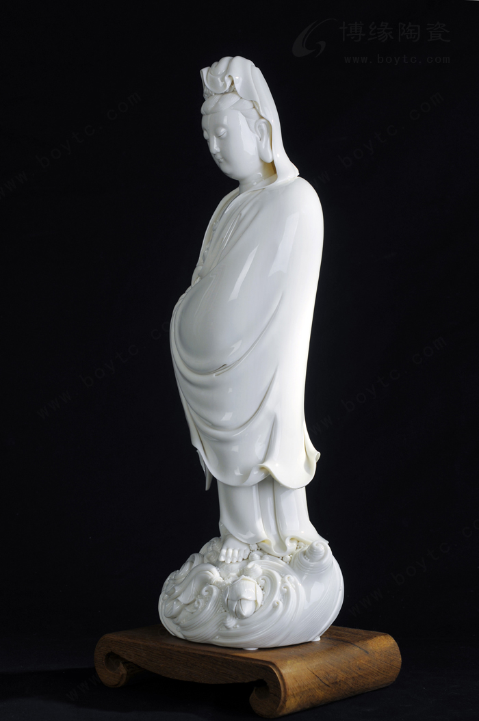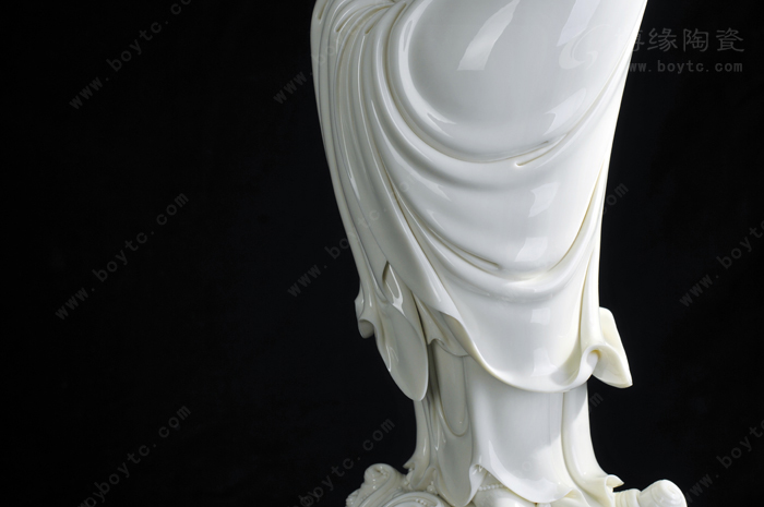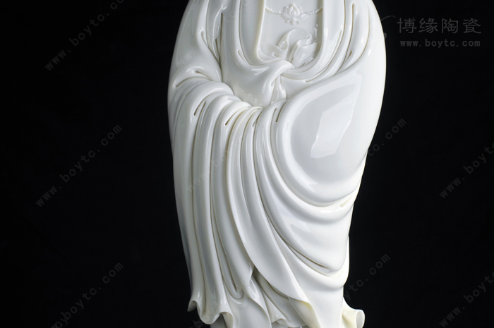 作品《渡海觀音》以德化白瓷為胎質(zhì),圓勁有力如凝脂似玉,滋潤瑩滑。線條清晰、簡潔、瀟灑,多變化,柔媚流暢,翻轉(zhuǎn)自然,觀音雙手藏袖,露一足踏蓮花,另一足水花掩蓋,作踏浪凌波渡 海之勢。神情嫻雅平靜,安詳自若,雙目低垂凝思。整座塑像精巧細致,神態(tài)如生。該作品2013年被永久收藏于福建省非物質(zhì)文化遺產(chǎn)博覽苑。