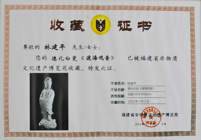 2013年1月作品《蒲團觀音》被征集為福建省工藝美術(shù)珍品,收藏于福建省工藝美術(shù)珍品館。