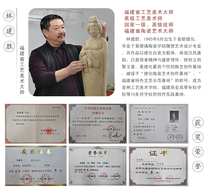 林建勝,男,1965年8月出生,福建德化人,景德鎮(zhèn)陶瓷學(xué)院雕塑藝術(shù)設(shè)計(jì)專(zhuān)業(yè)畢業(yè),高級(jí)工藝美術(shù)師,國(guó)家一級(jí)/高級(jí)技師,福建省美術(shù)家協(xié)會(huì)會(huì)員,中國(guó)收藏家喜愛(ài)的陶瓷藝術(shù)大師,福建省工藝美術(shù)大師,福建省陶瓷藝術(shù)大師,福建省技術(shù)能手,德化聚玉堂藝術(shù)總監(jiān)。