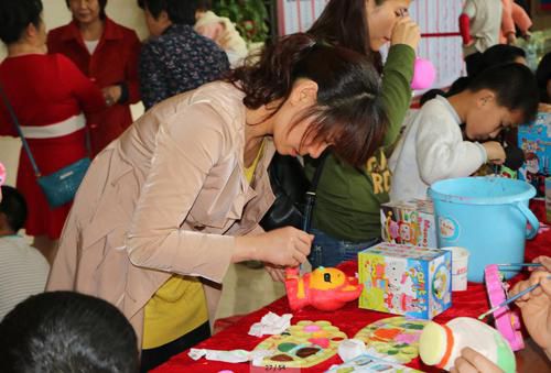 筆者看到,嘉賓們都仿佛變身藝術(shù)家一樣,一手拿著畫筆,一手托著調(diào)色板。面對著陶瓷娃娃,一筆一筆描繪出象征活力與熱情的繽紛色彩。只見喜洋洋、悠悠豬、叮當(dāng)貓、紅太郎、灰太狼……形象各異、妙趣橫生的陶瓷娃娃形象,在嘉賓們靈巧的雙手下逐漸成型。一些小嘉賓的手上更是沾上了五顏六色的色彩,煞是好看。濃厚的藝術(shù)氛圍伴隨著家長與孩子歡快的交談與爽朗的笑聲,一幅幅幸福溫馨的畫面呈現(xiàn)在了人們的面前。