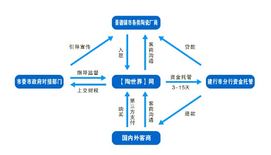 結合建設銀行景德鎮(zhèn)市分行對所有交易資金托管,保障了交易資金的安全,大大提高了買賣雙方的公信力。通過多種推廣方式,讓國內外的客商第一時間看到發(fā)布的產品。保證了每天的交易數(shù)量,這樣就把全市分散的商家集中到一起,統(tǒng)一對外宣傳,改變了以往景德鎮(zhèn)陶瓷市場分散零亂的現(xiàn)象。入駐商家還通過網(wǎng)站動態(tài)充分了解市場需求,針對市場要求專業(yè)創(chuàng)新制作,提高設計制作水平。市場開發(fā)拓展則完全交由【陶世界】網(wǎng)來實現(xiàn)。見如下框架圖: