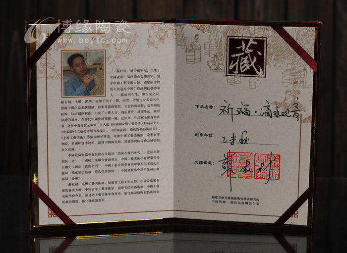蘇杜村,號帝蘊明家,高級工藝美術(shù)師、國家高級雕塑技師,現(xiàn)任德化縣誠毅陶瓷藝術(shù)研究所藝術(shù)總監(jiān),系中國陶瓷工業(yè)協(xié)會陶瓷藝術(shù)委員會常務(wù)理事、福建省工藝美術(shù)學會理事,榮獲福建省工藝美術(shù)大師、福建省陶瓷藝術(shù)大師、中國收藏家喜愛的藝術(shù)大師、中國青年工藝美術(shù)家、福建省民間藝術(shù)家、泉州青年五四獎?wù)碌确Q號。