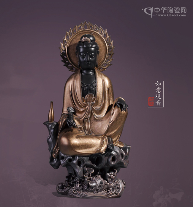 “在德化一般人眼里,佛像都是白瓷和彩瓷來表現(xiàn)的,我做的佛像卻大都是用高端釉藝來表現(xiàn)。”鄭國明說,做佛像時(shí),他巧妙地運(yùn)用型與色結(jié)合裝飾,衣服的顏色用 “古亞金釉”,膚色用陶的本色或用亞光彩虹黑釉來體現(xiàn),底座再用鐵銹釉來表現(xiàn),裝飾效果顯得華而不艷,莊重古樸,端莊凝重中滲透出無限的智慧和慈悲的情懷。