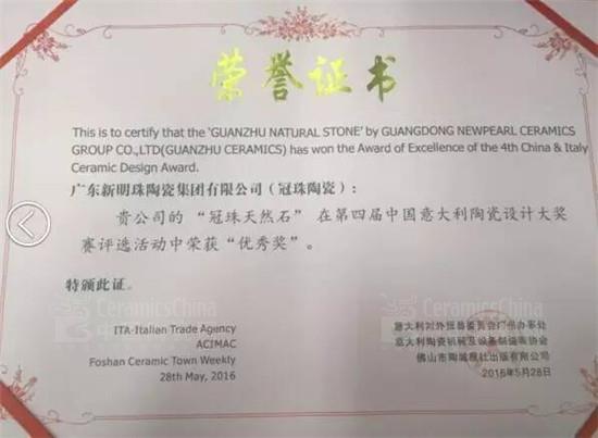5月28日晚,由陶城報(bào)與意大利對(duì)外貿(mào)易委員會(huì),意大利陶瓷機(jī)械及設(shè)備制造商協(xié)會(huì),傾力打造的第四屆中意陶瓷設(shè)計(jì)大獎(jiǎng)賽召開。冠珠陶瓷天然石瓷磚榮獲優(yōu)秀獎(jiǎng)。