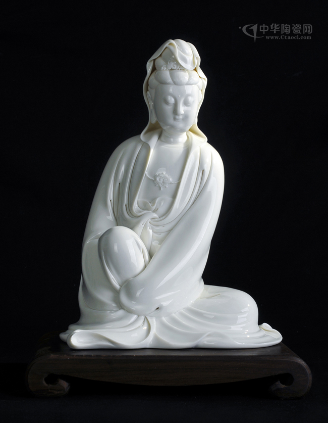 作品《渡海觀音》以德化白瓷為胎質(zhì),圓勁有力如凝脂似玉,滋潤瑩滑。線條清晰、簡潔、瀟灑,多變化,柔媚流暢,翻轉(zhuǎn)自然,觀音雙手藏袖,露一足踏蓮花,另一足水花掩蓋,作踏浪凌波渡 海之勢。神情嫻雅平靜,安詳自若,雙目低垂凝思。整座塑像精巧細(xì)致,神態(tài)如生。該作品2013年被永久收藏于福建省非物質(zhì)文化遺產(chǎn)博覽苑。
