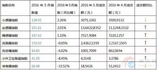 表四、2016年5月與2016年4月衛(wèi)生陶瓷系列指數(shù)走勢(shì)與成交額對(duì)比