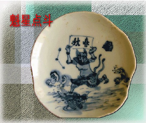 到了明代晚期,“獨(dú)占鰲頭”的瓷畫(huà)已經(jīng)逐漸和“魁星點(diǎn)斗”結(jié)合在一起。在科舉時(shí)代,通過(guò)參加考試以求仕進(jìn),幾乎是讀書(shū)人唯一的晉身之階,所以衍生出很多吉祥用語(yǔ),如“登龍門(mén)”、 “獨(dú)占鰲頭”,等等,這其中“魁星點(diǎn)斗”的說(shuō)法,非常流行。民間傳說(shuō),魁星原是一位讀書(shū)人,連續(xù)三次在科舉考試中取得“連中三元”的佳績(jī),卻都因貌丑而被黜退,他萬(wàn)念俱灰,投水自盡,感動(dòng)天神,命大鰲將其救起,升上天庭作了司職人間文運(yùn)的神祇。