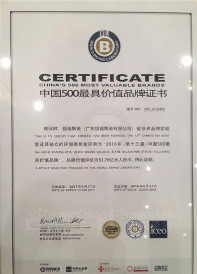 恒福陶瓷連續(xù)3年入選中國500最具價值品牌榜,這與恒福十六年如一日堅持品質(zhì)致勝和創(chuàng)新發(fā)展密不可分,也是恒福在品牌建設上堅持不懈的大膽投入、循序漸進和厚積薄發(fā)的結果。自2014年首次入選中國500最具價值品牌榜后,恒福陶瓷品牌價值從首次的36.65億元,到2015年的43.79億元,再到今年的51.76億元,品牌價值迅速飆升,向世人展示了恒福陶瓷奮發(fā)進取、強勢崛起的形象。