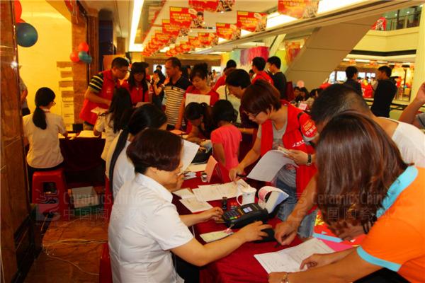 品嘗完意利寶陶瓷為業(yè)主們準(zhǔn)備的精心佳肴,欣賞完精彩的表演節(jié)目后,下午1點(diǎn)整,當(dāng)主持人宣布購(gòu)磚活動(dòng)開始時(shí),業(yè)主們?cè)缫寻崔嗖蛔⌒闹行苄苋紵馁?gòu)磚之火,到處可見業(yè)主們?nèi)宄扇壕墼谝黄鸶`竊私語(yǔ)商量討論著選購(gòu)哪款瓷磚,迫不及待紛紛搶購(gòu)下定,導(dǎo)購(gòu)區(qū)、收銀區(qū)工作人員忙得不亦樂(lè)乎,簽單不斷。