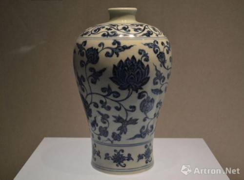 瓶小口,圓唇,短頸,豐肩,圓腹下收。通體青花裝飾,肩部飾忍冬紋,腹部繪纏枝蓮紋,脛部為析枝花卉紋。蓮花在佛教藝術(shù)中被奉為"佛門圣花"。宋周敦頤"愛蓮說"謂:余獨(dú)愛蓮之出污尼而不染,稱譽(yù)蓮花清高圣潔的品格。蓮花是我國瓷器上典型的裝飾圖案,自南朝至清代一直盛行不衰。明代瓷器上蓮花紋多種多樣,有纏枝,折枝,串枝等形式。此器造型雋秀,胎體輕薄,胎質(zhì)潔白細(xì)膩,釉面光潤,青花采用"蘇麻離青"料,色調(diào)清雅明朗,紋飾描繪盤曲迂回,瀟灑自然,線條舒展柔美,為永樂青花瓷的代表作。