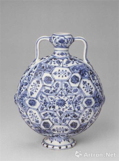 青花花卉錦紋雙耳扁瓶,明永樂,高24.3cm,口徑3.5cm,足徑7.4cm。瓶蒜頭口,束頸,圓形扁腹?诩邕B以對稱的如意耳,腹兩側(cè)正中各凸飾一乳釘紋,璧形底足,無款識。瓶口邊繪如意紋,腹部紋飾以六角星開光向四周伸展構(gòu)成六邊形錦式開光,開光內(nèi)繪折枝花、纏枝花、朵花、團花、江崖海水等紋飾,足邊繪朵梅紋一周。此瓶造型仿自阿拉伯銅器,紋飾的題材與布局都具有西亞風(fēng)格。