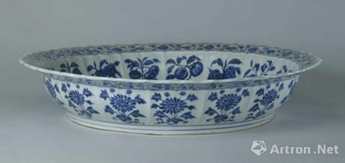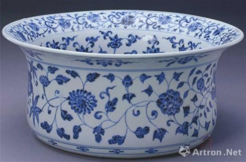 青花纏枝花紋折沿盆,明永樂,高13.9cm,口徑31.6cm,底徑21.5cm。盆折沿,腹垂直,平底露胎。里外青花裝飾。盆里沿繪纏枝花一周,內(nèi)壁繪纏枝花7朵,盆底繪回紋一周,回紋內(nèi)繪八瓣團花,花瓣呈變形蕉葉紋,紋內(nèi)又繪暗八仙。盆外沿繪折枝花卉8朵,外壁繪纏枝花卉7朵,底邊繪變形朵花紋一周。外底素胎無釉。無款識。此盆青花呈色濃艷,有暈散現(xiàn)象,為蘇泥勃青料所致。紋飾繁復(fù)生動,層次分明,是永樂時期受西亞國家金銀器的影響而創(chuàng)燒的一種新器型。