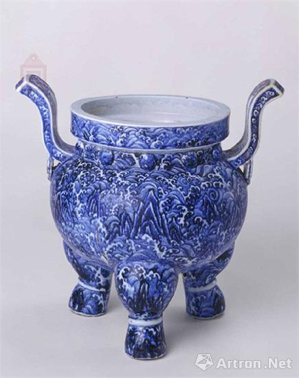 青花纏枝花紋罐,明永樂,高17cm,口徑14.4cm,足徑9cm。罐直口,溜肩,鼓腹,小圈足。通體青花裝飾。頸上繪卷草紋,肩、圈足外墻均繪海水紋,腹部繪纏枝花紋,近足處繪如意云頭含靈芝紋。圈足內(nèi)施白釉。無款識。此器造型新穎,紋飾繁密,描繪細(xì)膩,形制和紋飾均受到伊斯蘭文化的影響。