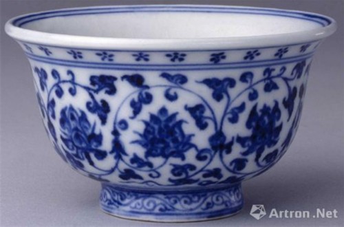 青花壓手杯(花心),明永樂,高4.9cm,口徑9.2cm,足徑3.9cm。杯體如小碗狀,口微撇,折腰,豐底,圈足。內(nèi)外均繪青花紋飾。杯心有葵花一朵,花心署青花篆體 “永樂年制”四字款。外壁口沿下繪朵梅,腹部繪纏枝蓮紋。壓手杯是明代永樂時期景德鎮(zhèn)御窯廠創(chuàng)制的新型瓷杯。此杯制作精細(xì),形體古樸敦厚,青花色調(diào)深翠。壓手杯的特點為胎體厚重,重心在杯的下部,口沿微微外撇,手握杯時,正壓合于手的虎口處,給人以沉重壓手之感,故有“壓手杯”之稱。明代永樂青花壓手杯是明代瓷器中能與文獻(xiàn)記載相互印證的一種實物,具有重要的研究價值。明人谷應(yīng)泰撰《博物要覽》一書中特別提到了這種杯:“若我永樂年造壓手杯,坦口,折腰,砂足滑底。中心畫有雙獅滾球,球內(nèi)”大明永樂年制“六字或四字篆書,細(xì)若米粒,此為上品;鴛鴦心者次之;花心者又其次也。杯外青花深翠,式樣精妙,傳世可久,價亦甚高。”在故宮博物院的藏品中,有雙獅繡球內(nèi)書年款和花心內(nèi)書年款的永樂青花壓手杯。另有杯心為鴛鴦臥蓮圖案者,系明萬歷時期仿制。此種品質(zhì)精良且?guī)в杏罉纺昕畹膲菏直,?jù)目前掌握的資料看,僅故宮博物院收藏有4件。