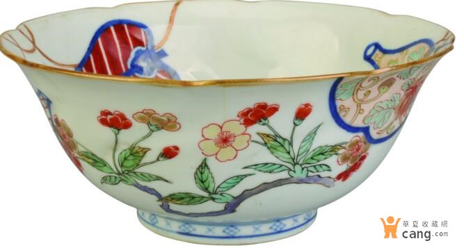 再說(shuō)這件青花五彩碗上的葫蘆與扇子圖案,葫蘆紋是中國(guó)傳統(tǒng)吉祥圖案之一,因葫蘆多子,故民間象征子孫萬(wàn)代之意。又以葫蘆諧音福祿,故更賦予吉祥寓意。另外,葫蘆形狀獨(dú)特而美觀,尤其是道教人士常將其掏空,作為裝水、裝酒用具,視作寶物,這更使葫蘆增添了一種神秘感。值得一提的是,清代流行一種“暗八仙”紋飾,即以八仙手中的法器、寶物為紋樣,其中葫蘆是鐵拐李的法器、扇子是漢鐘離的法器、呂洞賓為寶劍、張果老為魚(yú)鼓、曹?chē)?guó)舅為陰陽(yáng)板、韓湘子是笛子、藍(lán)采和是花籃、何仙姑是荷花。這種“暗八仙”紋飾正是始見(jiàn)于康熙時(shí)期,后來(lái)則多將八種法器同時(shí)出現(xiàn),此康熙青花五彩碗上的葫蘆與扇子或?yàn)?ldquo;暗八仙”紋飾的雛形階段。