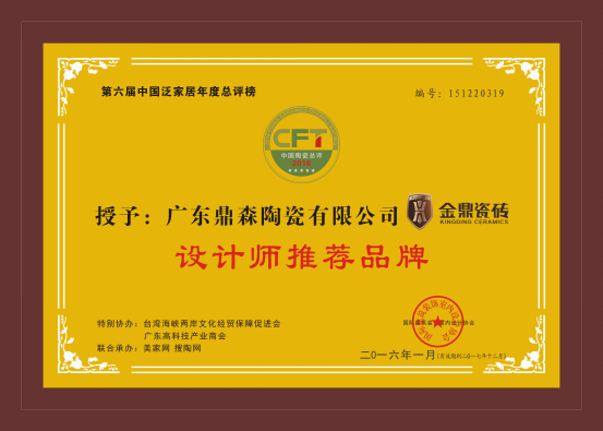 黃先生表示跟著這樣的隊伍走,前景十分可觀,事實證明,他的選擇是對的。金鼎陶瓷品質(zhì)有保障,性價比高,是陶瓷一線品牌(Ceramicfirstbrand)和設計師推薦品(Designersrecommendbrand),并連續(xù)兩年獲得中國陶瓷十大品牌(Chinaceramictoptenbrands)!