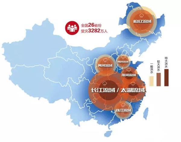 自6月30日以來,長江中下游沿江地區(qū)及江淮、西南東部等地出現(xiàn)入汛以來最強降雨過程。截至7月3日,全國已有26。▍^(qū)、市)1192縣遭受洪澇災(zāi)害,受災(zāi)人口3282萬人,因災(zāi)死亡186人、失蹤45人,倒塌房屋5.6萬間,直接經(jīng)濟損失約506億元。