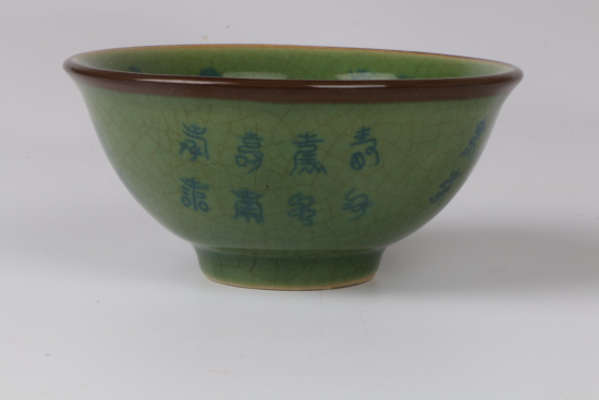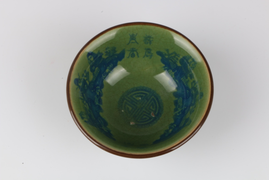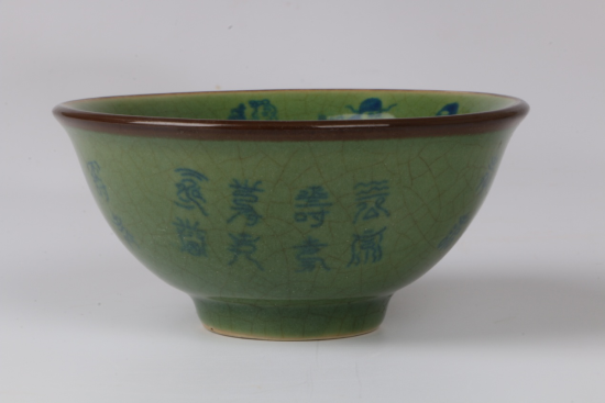 此藏品碗撇口,弧腹,圈足內(nèi)收。碗內(nèi)繪畫風(fēng)格人物故事紋,使用上等青花料,神韻古樸。外壁及內(nèi)底施壽字。碗底有“大明宣德年制”六字兩行楷書款口沿處因為在高溫狀態(tài)下釉層熔融垂流致使釉層變薄而顯露胎骨。足邊無釉處露出麻倉土胎體表面火石紅色,愛瓷人定然愛不釋手。翠青釉因其色澤光潤,青嫩如翠而得名。
