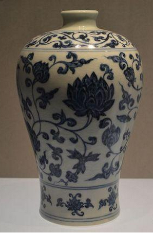 瓶小口,圓唇,短頸,豐肩,圓腹下收。通體青花裝飾,肩部飾忍冬紋,腹部繪纏枝蓮紋,脛部為析枝花卉紋。蓮花在佛教藝術(shù)中被奉為"佛門圣花"。宋周敦頤"愛蓮說"謂:余獨(dú)愛蓮之出污尼而不染,稱譽(yù)蓮花清高圣潔的品格。蓮花是我國瓷器上典型的裝飾圖案,自南朝至清代一直盛行不衰。明代瓷器上蓮花紋多種多樣,有纏枝,折枝,串枝等形式。此器造型雋秀,胎體輕薄,胎質(zhì)潔白細(xì)膩,釉面光潤,青花采用"蘇麻離青"料,色調(diào)清雅明朗,紋飾描繪盤曲迂回,瀟灑自然,線條舒展柔美,為永樂青花瓷的代表作。