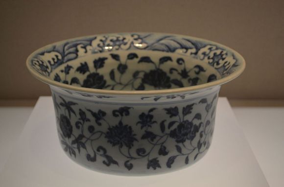 盆敞口,折沿,深腹,平沙底。通體飾青花紋樣,外口沿為折枝花卉紋,外壁繪纏枝牡丹紋,內(nèi)口沿繪江牙海水紋,內(nèi)壁繪纏枝花卉紋,內(nèi)心繪團(tuán)花紋。明代永樂宣德時期是中國青花瓷生產(chǎn)的黃金時代,其品種多樣,造型豐富。此器為永樂朝的創(chuàng)新式樣,形制仿自伊朗黃銅折沿盆,而裝飾是中國傳統(tǒng)紋樣,反映出明初中外文化交流與影響。造型簡潔飽滿,青花色澤濃艷,紋飾清新雅致。宣德時期有同樣形制和紋飾的器物,宣德器渾厚凝重,永樂器輕盈秀美,藝術(shù)風(fēng)格不同。清雍正時期有仿,但紋飾纖柔,線條不夠豪放。