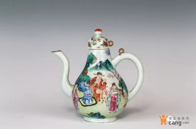 推薦理由:此壺壺形曲線優(yōu)美,壺把環(huán)狀設(shè)計(jì)與蓋上環(huán)狀設(shè)計(jì)工藝繁復(fù)講究,倘系一繩能使蓋不致遺失;壺身畫(huà)片人物眾多且神態(tài)逼真各異,施彩厚重,彩料保持完好且勻凈而明艷。行內(nèi)有言:礬紅不描金,到頭一場(chǎng)空,主體人物衣裾飄飄且金水動(dòng)人,倘立博古架上或立茶臺(tái),不失為一道古意盎然的風(fēng)景。