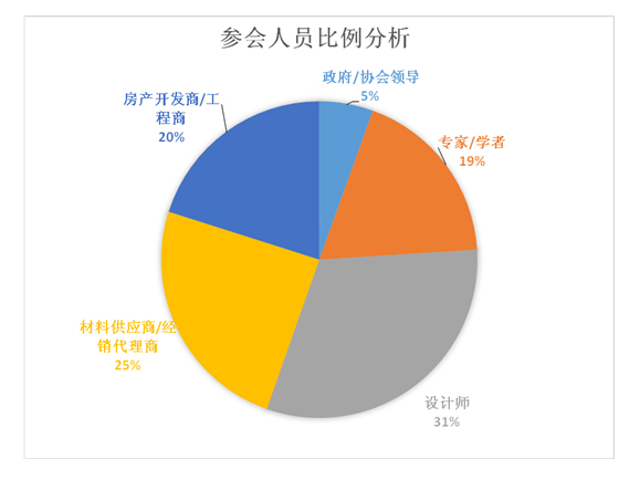 參會(huì)人數(shù)達(dá)到2037人,其中政府部門(mén)/協(xié)會(huì)領(lǐng)導(dǎo)占總?cè)藬?shù)5.5%;建筑及建材行業(yè)領(lǐng)域?qū)<、學(xué)者占總?cè)藬?shù)18.5%;設(shè)計(jì)師占總?cè)藬?shù)31.4%;材料供應(yīng)商/經(jīng)銷(xiāo)代理商占24.5%;房產(chǎn)開(kāi)發(fā)商/工程商占總?cè)藬?shù)20.1%
