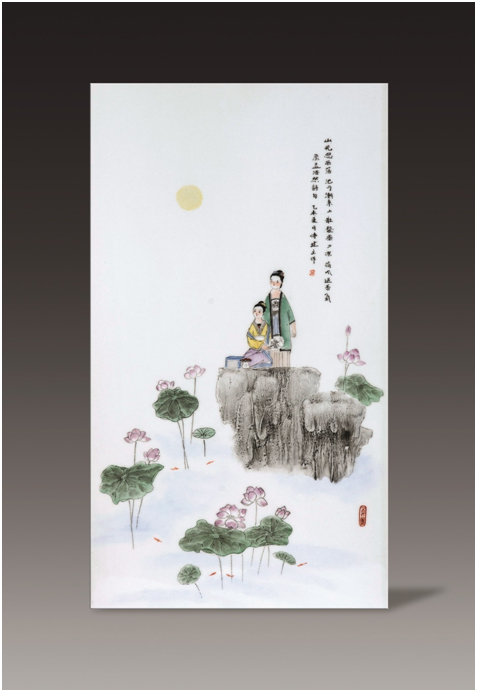 江西省高級工藝美術師傅建文作品:1尺8粉彩瓷板 孟浩然詩意