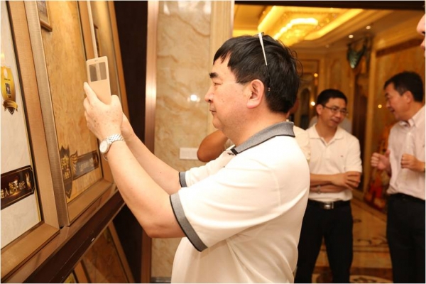(徐金鵬社長用手機(jī)掃描瓷磚上的二維碼,了解產(chǎn)品詳情)