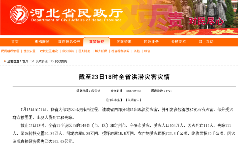 今年7月18日開始,河北遭遇到巨大災難。據河北省政府官網消息,截止23日18時,全省11個設區(qū)市的149縣(市、區(qū))和定州市、辛集市受災,受災人口904萬人,因災死亡114人、失蹤111人,緊急轉移安置30.89萬人,倒塌房屋5.29萬間、損壞房屋15.5萬間,農作物受災面積723.5千公頃,絕收面積30千公頃,因災造成直接經濟損失已達163.68億元。