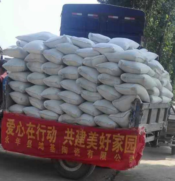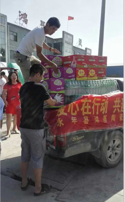 天災無情,人間有愛。位于河北省永年縣的河北鴻基陶瓷有限公司董事長黃國汀、夏惠鳳、董行樹等公司高層對這次受災高度重視,每天派人在各區(qū)和村及時的不停給當地災民送溫暖,把大米、油、方便面、火腿腸、消毒液等急需物質及時送到災民身邊。