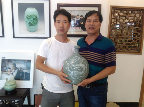 中國陶瓷設(shè)計藝術(shù)大師,麗水市工藝美術(shù)大師夏侯水平與記者合影