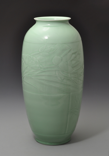 二〇一二年四月夏侯水平作品;龍泉青瓷梅子青(鴛鴦戲荷廣口瓶)參加由中國中國工藝美術(shù)館,中國國家博物館承辦的{中國當代工藝美術(shù)雙年展}