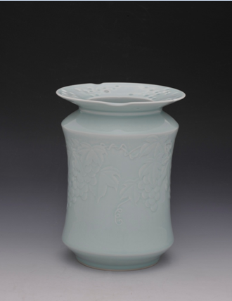 夏侯水平作品:造型新穎,釉色純正如玉,手工拉坯成型,裝飾到位,以葡萄小雞為題,彰顯農(nóng)村自然風貌,畫面采用陽刻真實自然,給人以濃郁的鄉(xiāng)風民俗美好光景。