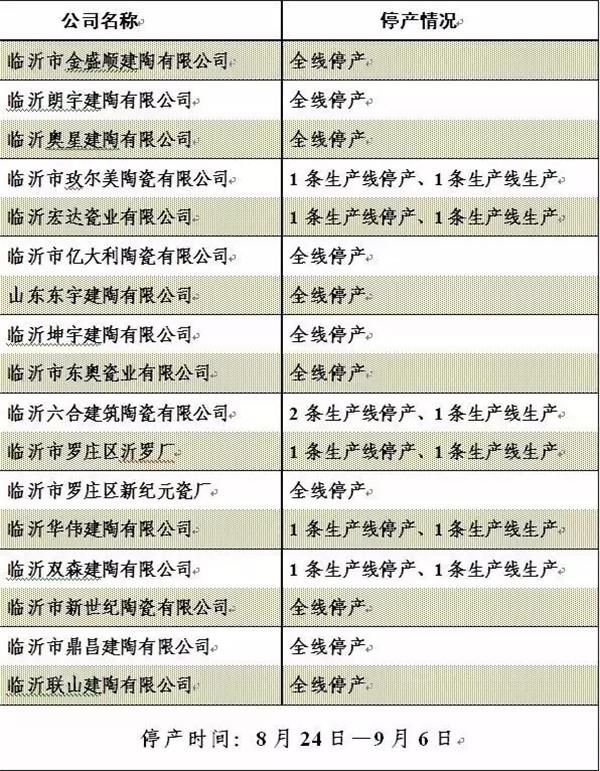 9月4日至9月5日,G20峰會將在杭州召開。期間,臨沂市將對建陶企業(yè)實行停產、限產。據悉,羅莊區(qū)共有55家陶瓷企業(yè)被停產、限產,涉及62條生產線,停產時間從8月24日至9月6日,共計14天。