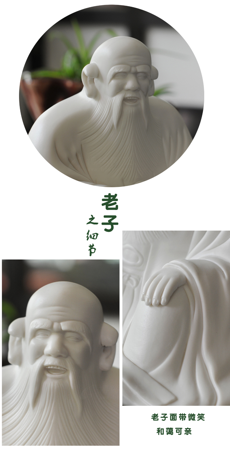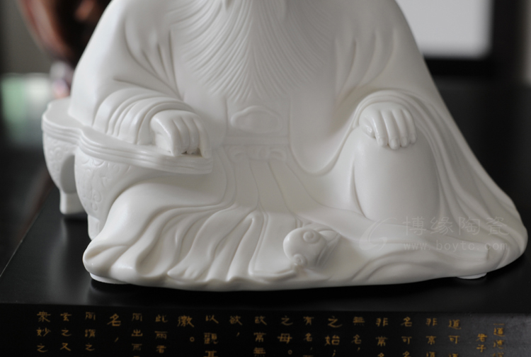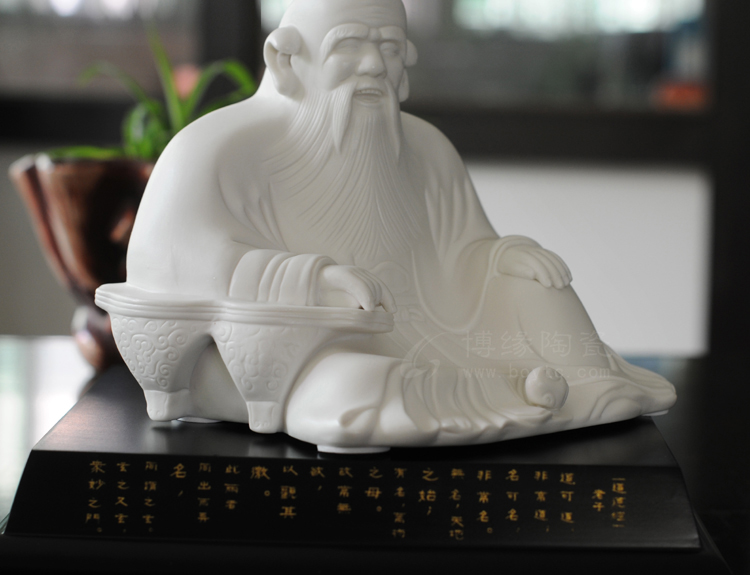 老君巖陶瓷雕塑作品以泉州清源山景區(qū)道教老君石雕造像為原型,采用陶瓷雕塑工藝經(jīng)工藝美術(shù)大師設(shè)計(jì)塑造,精選上等德化白瓷瓷泥,經(jīng)72道工序手工制作,并在1300多度高溫下燒制而成。作品精雕細(xì)刻,老君屈膝席地,雙手平放膝上,兩眼平視,充分顯示出慈祥和藹、從容安樂(lè)的神態(tài)。身上衣褶分明,線條刻劃柔而有力,頭、額、眼、須等細(xì)部雕刻精致寫實(shí)。